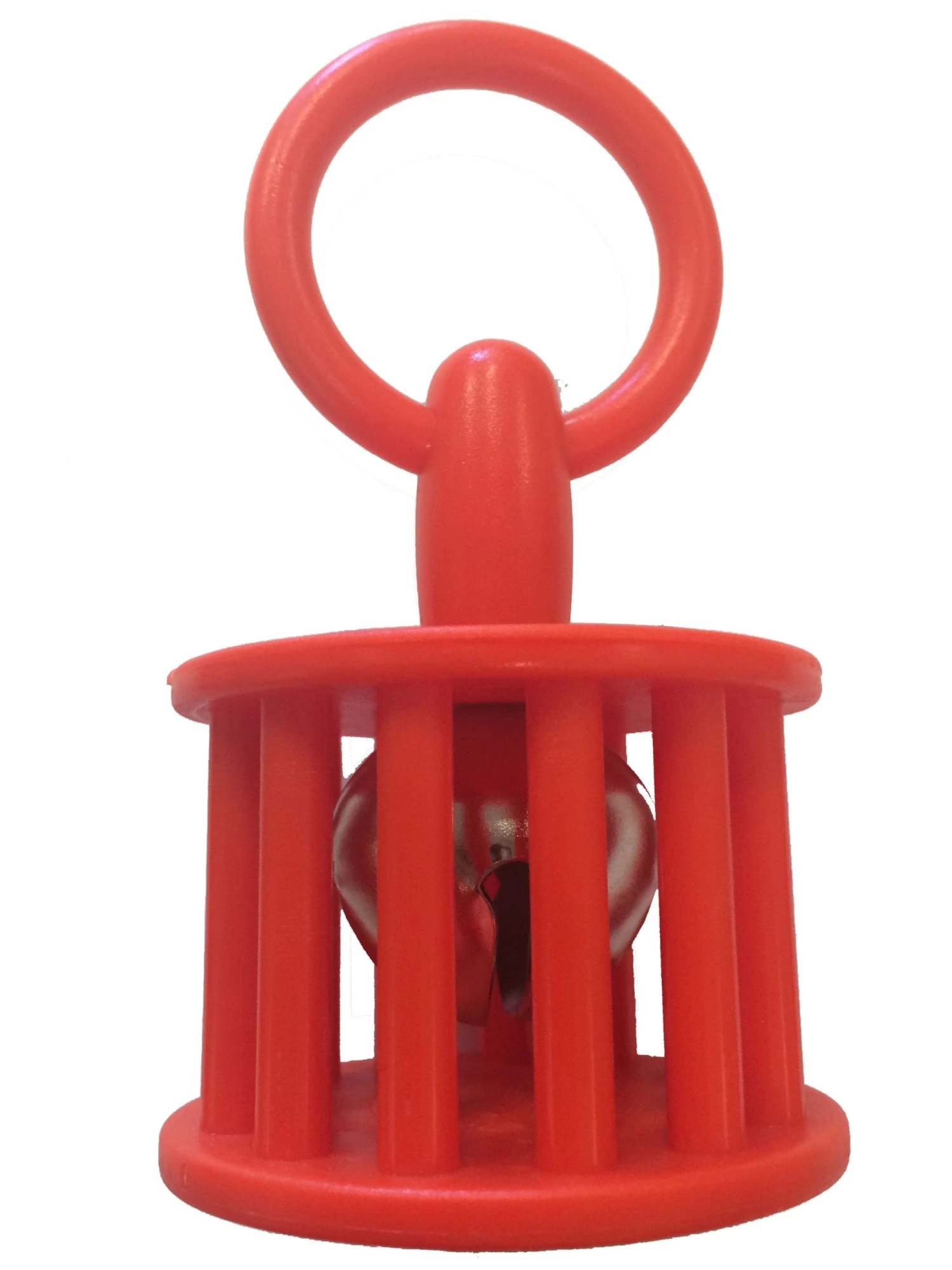 A securely attached large silver bell with cage and easy to grip loop handle. (2.5″ x 4.75″)