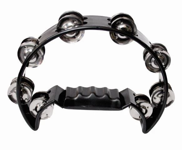 Mano 9 inch x 5 inch half moon tambourine Headless. ABS rim. 16 pairs of nickel silver jingles in double row. Full colour box packaging.