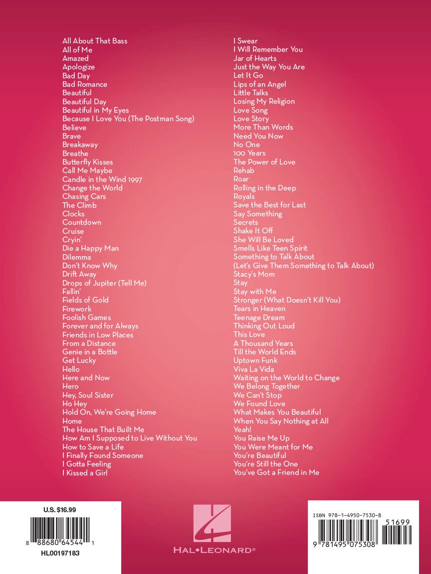 Songs include: All About That Bass • All of Me • Brave • Breakaway • Call Me Maybe • Clocks • Fields of Gold • Firework • Hello • Hey, Soul Sister • Ho Hey • I Gotta Feeling • I Will Remember You • Jar of Hearts • Love Story • 100 Years • Roar • Rolling in the Deep • Royals • Say Something • Shake It Off • Smells like Teen Spirit • Uptown Funk • When You Say Nothing at All • and more.