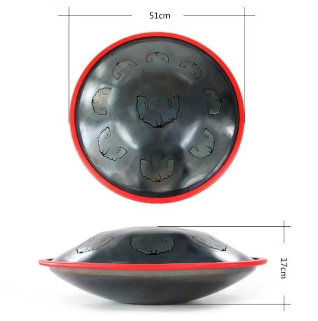 D Minor 9 notes hand pan (D3, A, Bb, C, D, E, F, G, A). Made of 100% Virgin Steel Alloy, 20 inches diameter and 6.7 inches high.