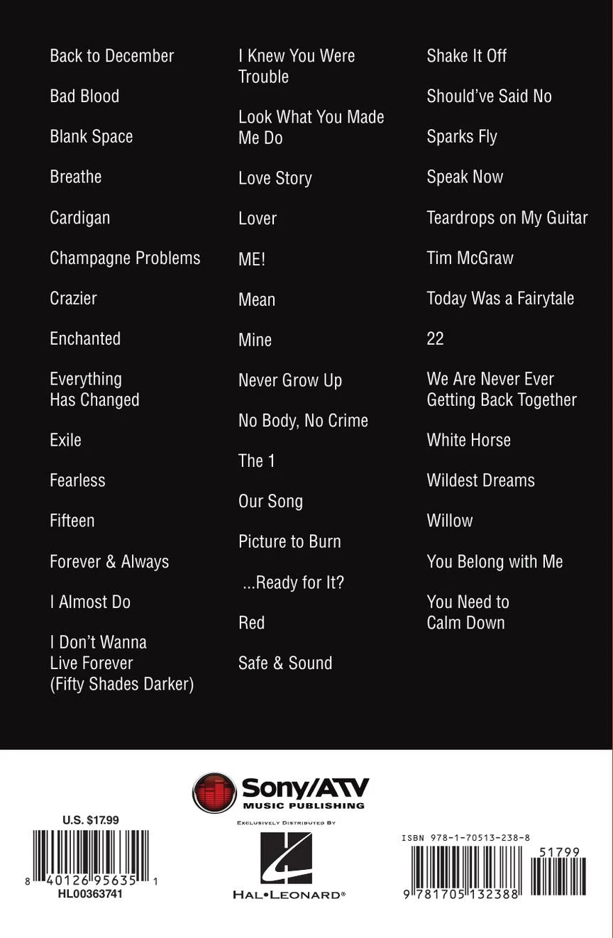 Get just what you need to play Taylor’s greatest hits on guitar! This third edition features 44 tunes with complete lyrics, chord symbols, and guitar chord diagrams from Taylor’s country as well as pop career. Includes: Back to December • Blank Space • Cardigan • Exile • Fifteen • I Knew You Were Trouble • Love Story • ME! • Mean • No Body, No Crime • Picture to Burn • Red • Shake It Off • Teardrops on My Guitar • We Are Never Ever Getting Back Together • Wildest Dreams • You Belong with Me • and more.