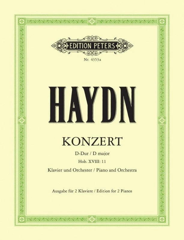Joseph Haydn’s Concerto No. 1 in D major, for Piano and Orchestra. Edition for two pianos (Solo Piano and Orchestral reduction) edited by Bruno Hinze-Reinhold. One two-piano score is provided; two are required for performance. Published by Edition Peters.