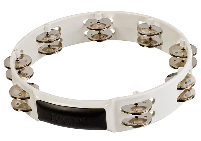 10″ PVC Shell Tambourine in White with 8 rows of double nickel plated jingles.Â